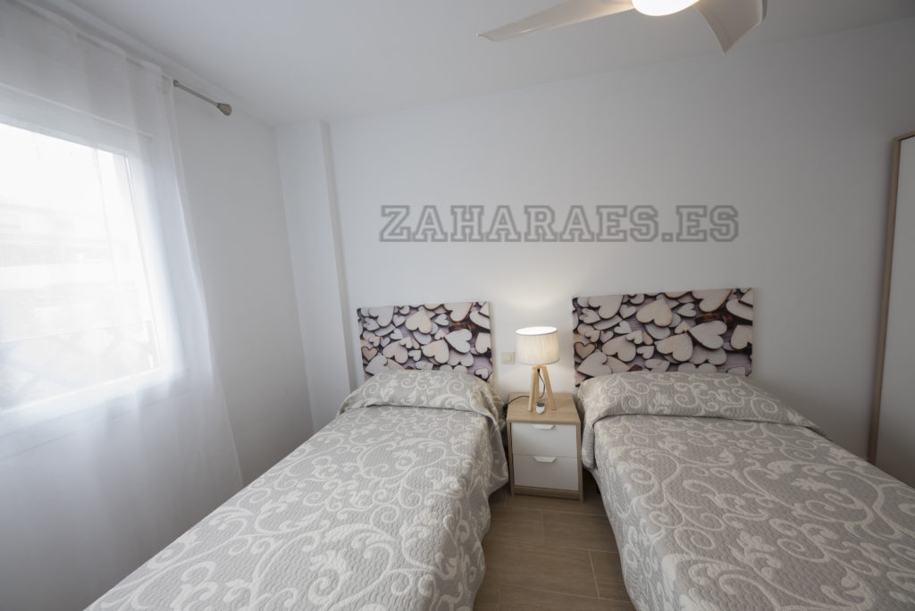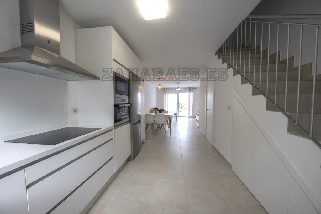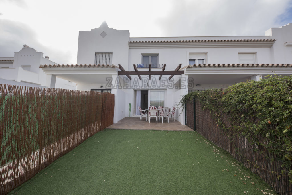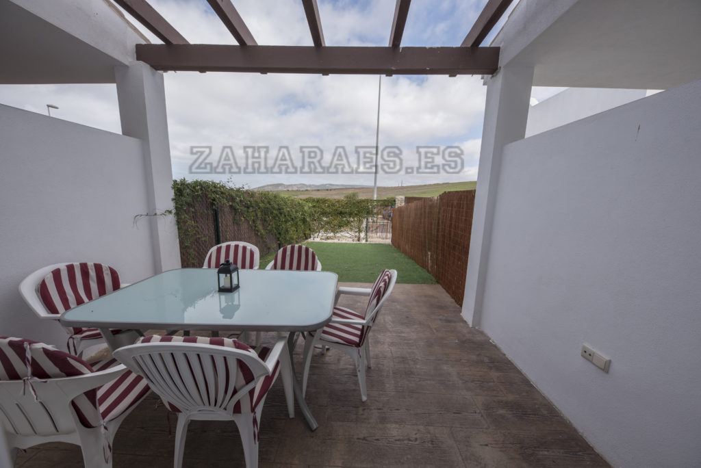 Vivienda adosada en la urbanización Miradores a escasos 8 minutos de la playa. La casa, con capacidad para cuatro personas, cuenta con 2 dormitorios y baño en la parte superior, en la inferior salón-comedor, aseo, cocina, porche y jardín, tiene ventiladores de techo en todas las habitaciones, garaje en planta sótano. Wifi. La urbanización tiene piscina de adulto e infantil. Al ser un conjunto residencial pequeño, es más familiar y cómoda, así como, al encontrase apartada de las zonas de ocio y de la afluencia de veraneantes la hace más tranquila.
