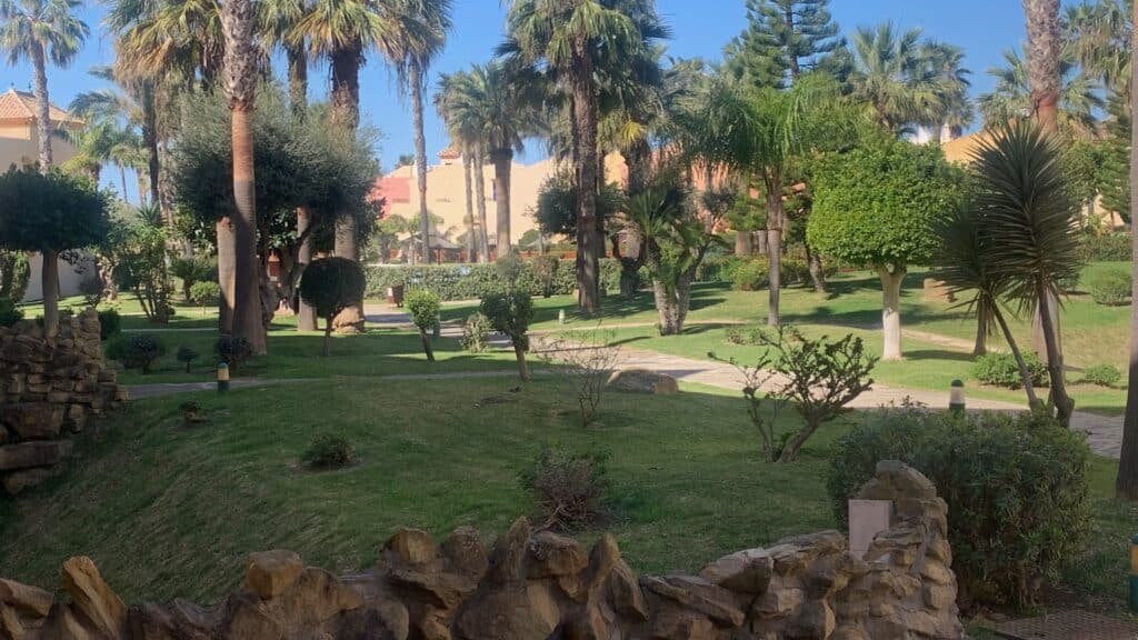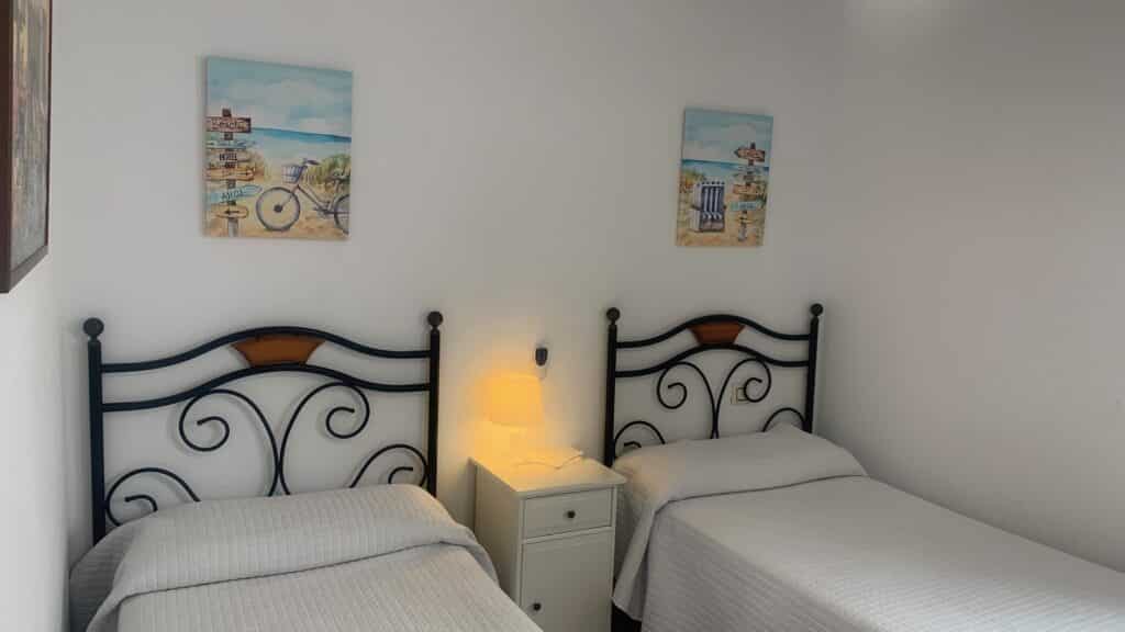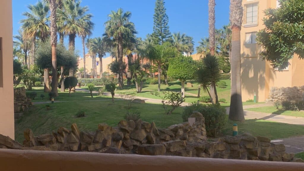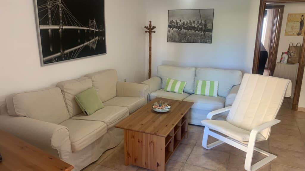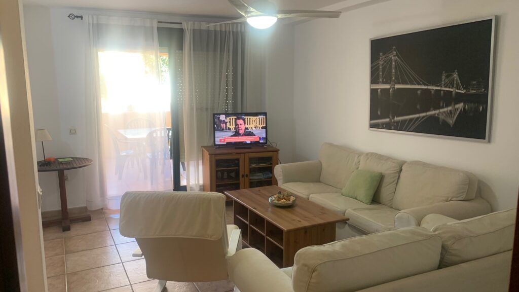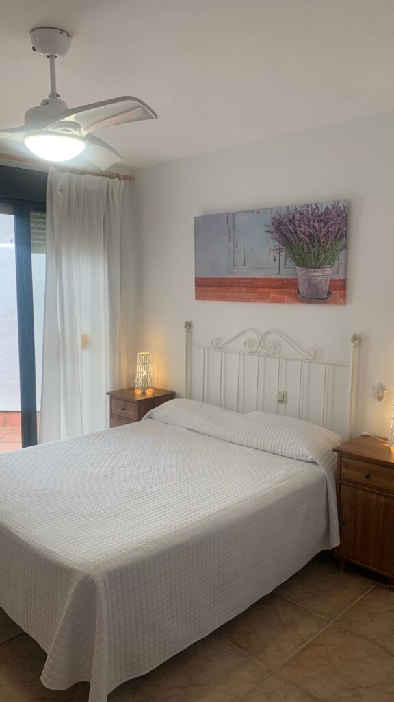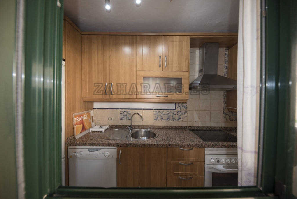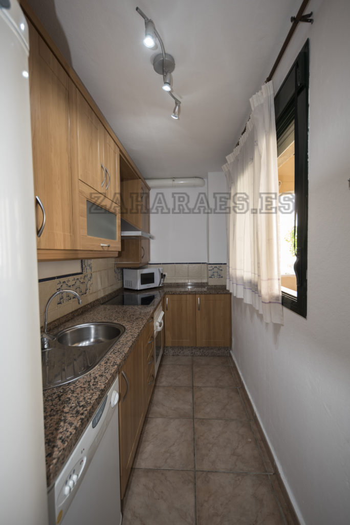 Apartamento en primera planta en la urbanización Jardines de Zahara, a 4 minutos de la playa, la cual cuenta con 2 piscinas de adulto e infantil, 2 pistas de pádel y zonas ajardinadas. El apartamento con orientación a poniente, tiene 2 dormitorios con ventilador de techo, 1 baño, cocina salón-comedor con ventilador de techo, terraza y patio interior, garaje en planta sótano con ascensor hasta la vivienda. Capacidad 4 personas