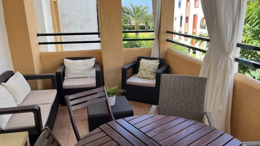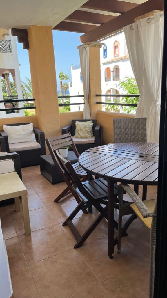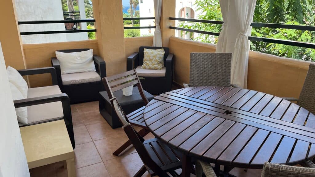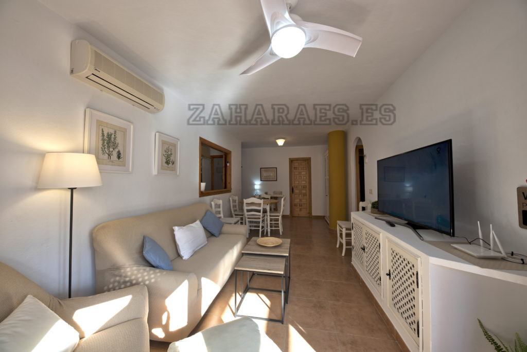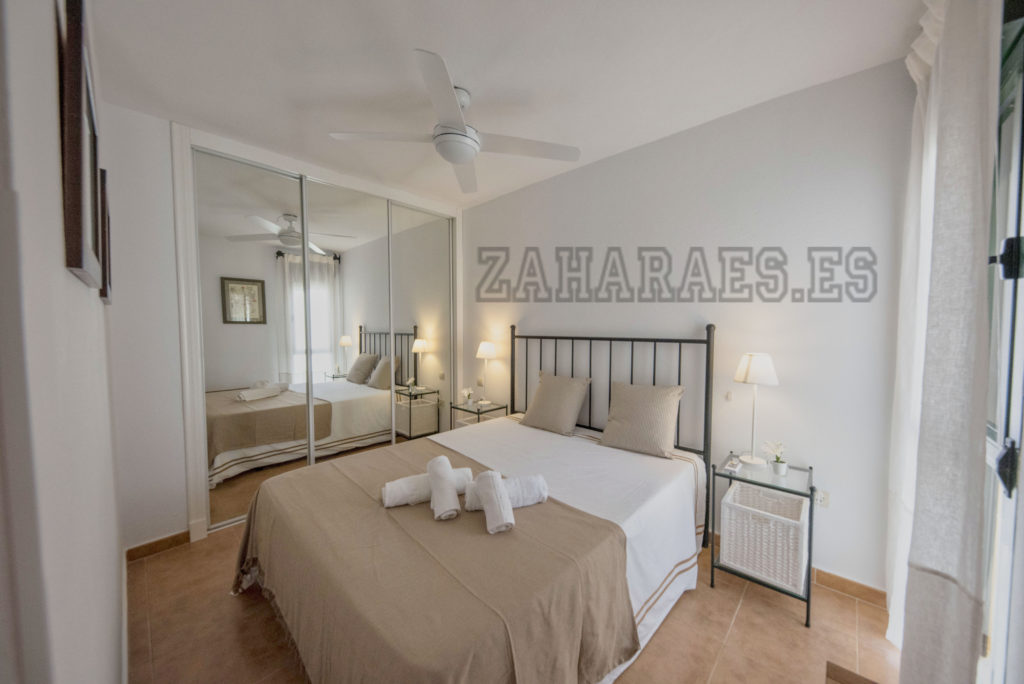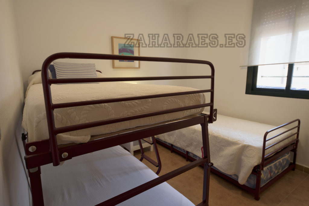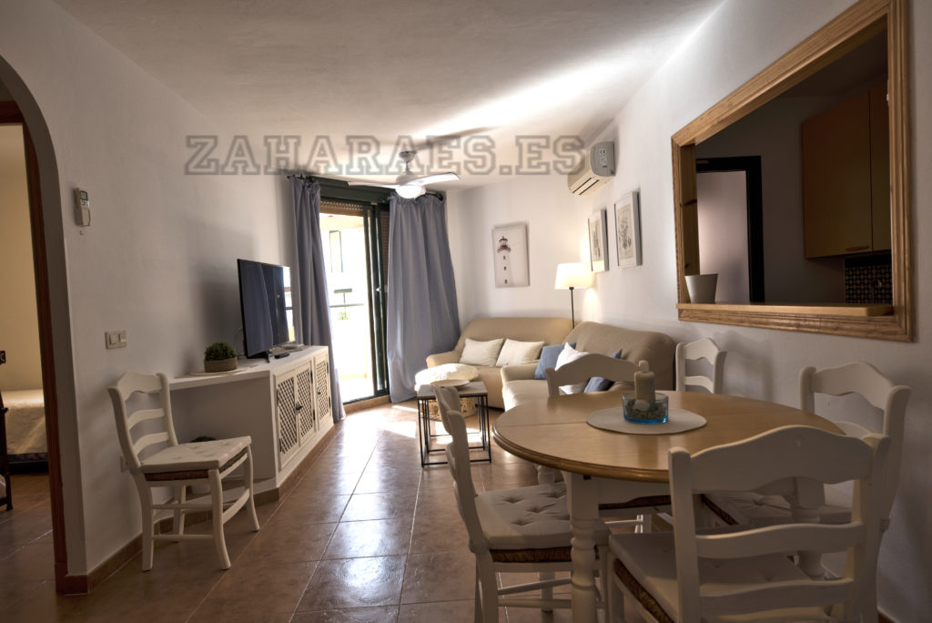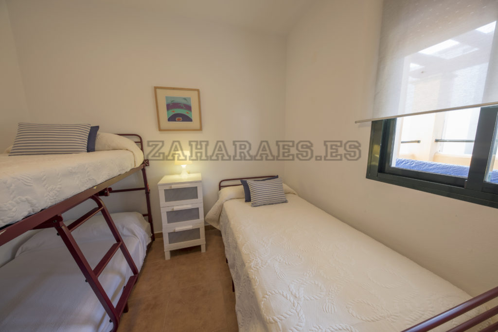 Apartamento, en segunda planta en la urbanización Atlanterra Playa, a 4 minutos de la playa, la cual cuenta con 2 piscinas de adulto e infantil, 4 pistas de pádel, parque infantil y zonas ajardinadas con acceso directo a la playa. El apartamento con orientación poniente, tiene 2 dormitorios, 1 baño, salón-comedor, cocina y terraza, aire acondicionado en salon-comedor, ventilador de techo, wifi y garaje en planta sótano con ascensor hasta la vivienda. Capacidad 5 personas. NO SE ADMITEN MASCOTAS